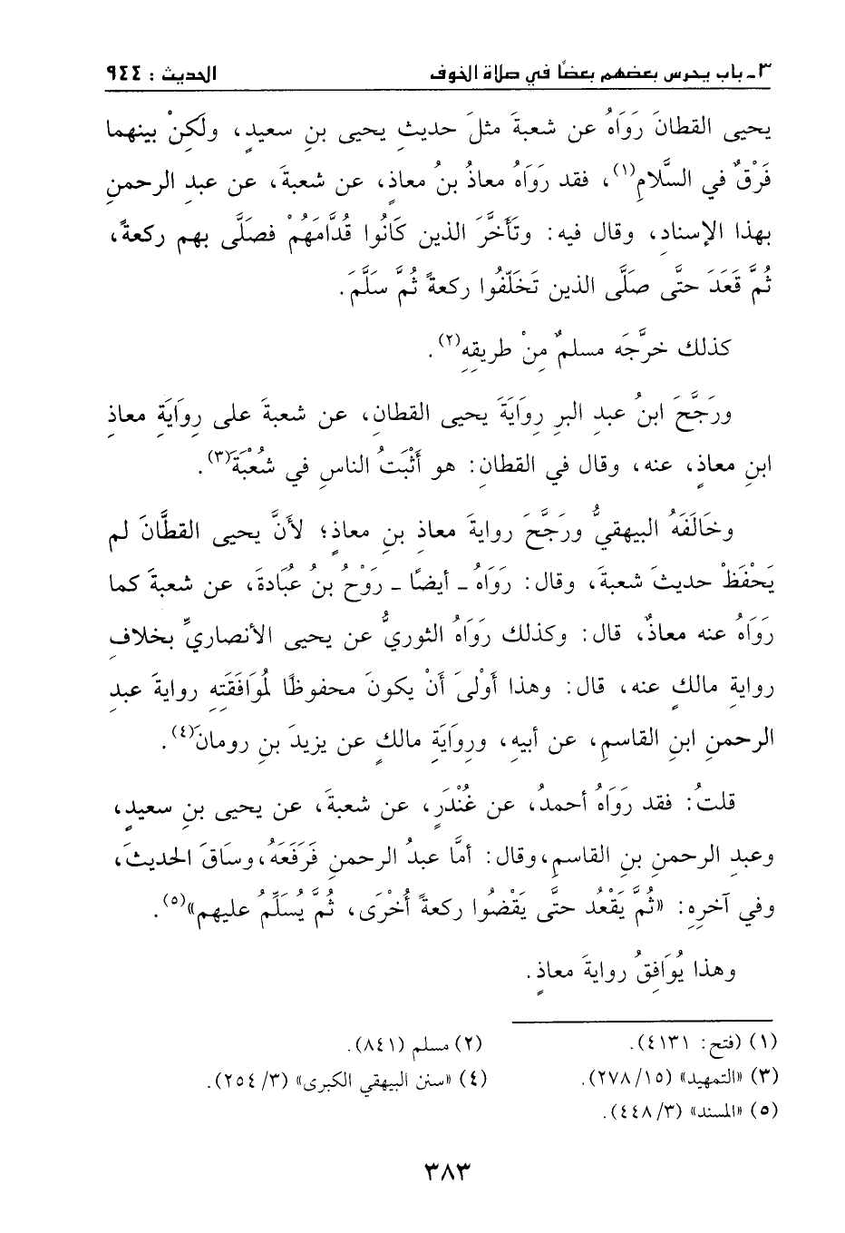 قلت: فقد رواه أحمد، عن غندر، عن شعبة، عن يحيى بن سعيد وعبد الرحمن بن القاسم، وقال: أما عبد الرحمن فرفعه، وساق الحديث، وفي آخره: ثم يقعد حتى يقضوا ركعة أخرى، ثم يسلم عليهم.
