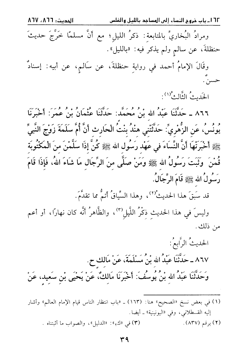 ومراد البخاري بالمتابعه، ذكر الليل، مع أن مسلماً خَرج حديث حنظلة عن سالمٍ، ولم يذكر فيه: ((بالليل)) .