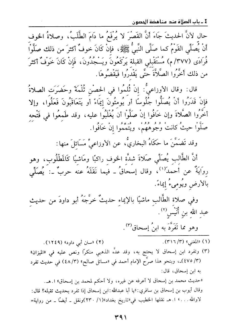 وفي صلاة الطالب ماشيا بالإيماء حديث، خرجه أبو داود من حديث عبد الله بن أنيس، وهو مما تفرد به ابن إسحاق.