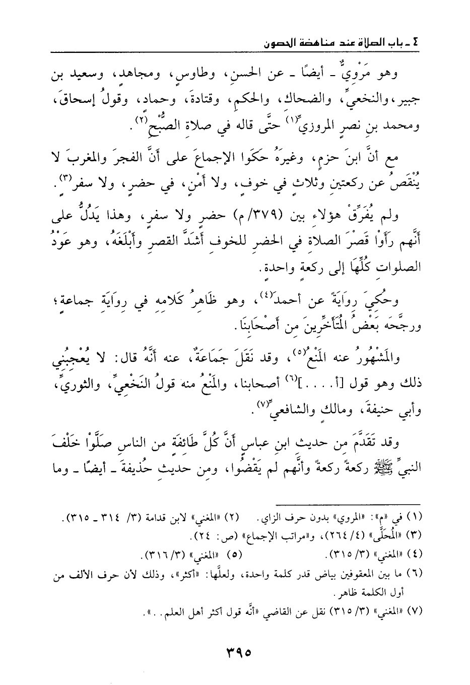 حتى قاله في صلاة الصبح، مع أن ابن حزم وغيره حكوا الإجماع على أن الفجر والمغرب لاينقص عن ركعتين وثلاث، في خوف ولا أمن، في حضر ولا سفرٍ.