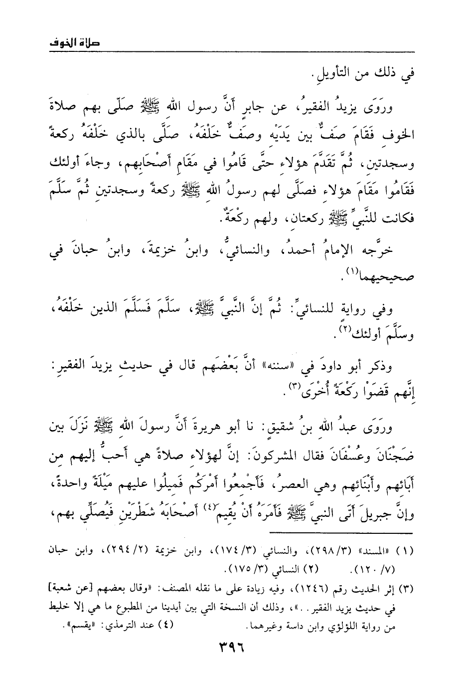 وروى يزيد الفقير، عن جابر، أن رسول الله - صَلَّى اللهُ عَلَيْهِ وَسَلَّمَ - صلى بهم صلاة الخوف، فقام صف بين يديه، وصف خلفه، صلى بالذي خلفه ركعة وسجدتين، ثم تقدم هؤلاء حتى قاموا في مقام أصحابهم، وجاء أولئك فقاموا مقام هؤلاء، فصلى لهم رسول الله - صَلَّى اللهُ عَلَيْهِ وَسَلَّمَ - ركعة وسجدتين، ثم سلم، فكانت للنبي - صَلَّى اللهُ عَلَيْهِ وَسَلَّمَ - ? ركعتان، ولهم ركعة.
