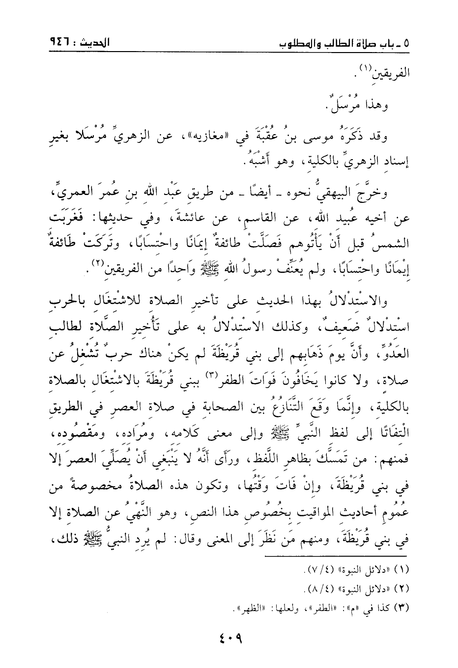 والاستدلال بهذا الحديث على تأخير الصلاة للاشتغال بالحرب، استدلال ضعيف، وكذلك الاستدلال به على تأخير الصلاة لطالب العدو؛ فإن يوم ذهابهم إلى بني قريظة لم تكن هناك حرب تشغل عن صلاة، ولا كانوا يخافون فوات العصر ببني قريظة بالاشتغال بالصلاة بالكلية، وإنما وقع التنازع بين الصحابة في صلاة العصر في الطريق، إلتفاتا إلى النبي - صَلَّى اللهُ عَلَيْهِ وَسَلَّمَ -، وإلى معنى كلامه ومراده ومقصوده: