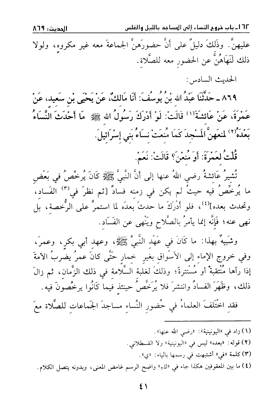 حدثنا عبد الله بن يوسف: أنا مالكٌ، عن يحيى بن سعيدٍ، عن عمرة، عن عائشه: قالت لو أدرك رسول الله - صَلَّى اللهُ عَلَيْهِ وَسَلَّمَ - ما أحدث النساء [بعده] لمنعهن المسجد كما منعت نساء بني إسرائيل.