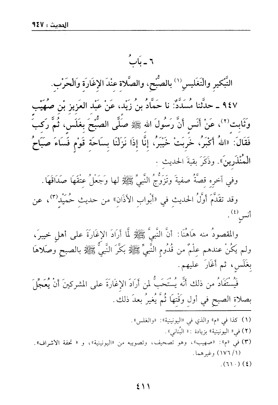 والمقصود منه هاهنا: أن النبي - صَلَّى اللهُ عَلَيْهِ وَسَلَّمَ - لما أراد الإغارة على أهل خيبر، ولم يكن عندهم علم من قدوم النبي - صَلَّى اللهُ عَلَيْهِ وَسَلَّمَ -، بكر النبي - صَلَّى اللهُ عَلَيْهِ وَسَلَّمَ - بالصبح، وصلاها بغلس، ثم أغار عليهم.