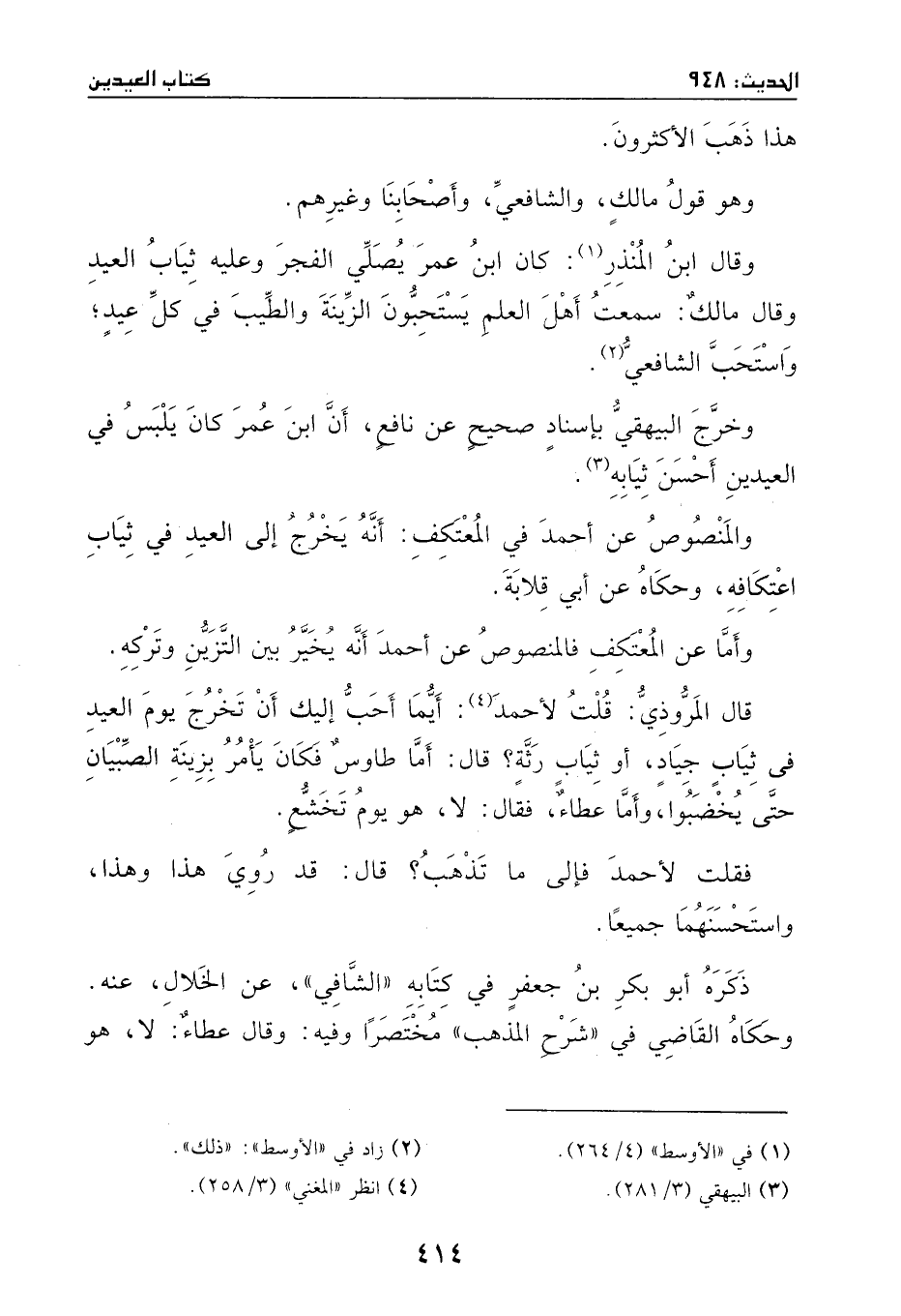 وخرج البيهقي بإسناد صحيح، عن نافع، أن ابن عمر كان يلبس في العيدين أحسن ثيابه.