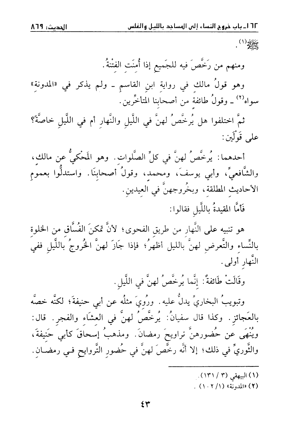 واستدلوا بعموم الأحاديث المطلقة، وبخروجهن في العيدين، فأما المقيدة بالليل، فقالوا: هو تنبيهٌ على النهار من طريق الفحوى؛ لأن تمكن الفساق من الخلوة بالنساء والتعرض لهن بالليل أظهر، فإذا جاز لهن الخروج بالليل ففي النهار أولى.