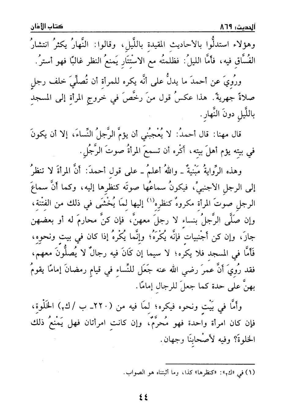وهذه الروايه مبينة –والله أعلم - على قول أحمد: إن المرة لا تنظر إلى الرجل الأجنبي، فيكون سماعها صوته كنظرها إليه، كما أن سماع الرجل صوت المرأة مكروهٌ كنظره إليها؛ لما يخشى في ذلك من الفتنة.