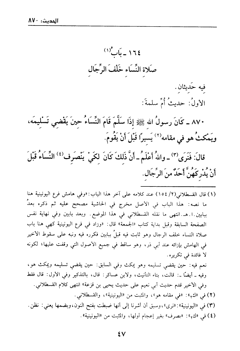 حديث أم سلمة: كان رسول الله - صَلَّى اللهُ عَلَيْهِ وَسَلَّمَ - إذا سلم قام النساء حين يقضي تسليمه ويمكث في مقامه هو يسيراً قبل أن يقوم.