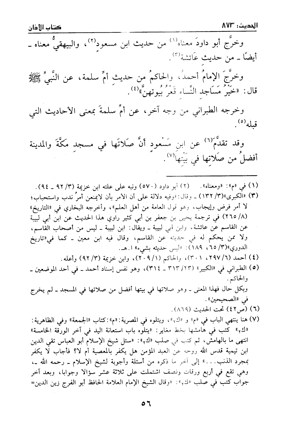 وخرج الإمام أحمد والحاكم من حديث أم سلمة، عن النبي - صَلَّى اللهُ عَلَيْهِ وَسَلَّمَ -، قال: ((خيرُ مساجد النساء قعر بيوتهن)) .