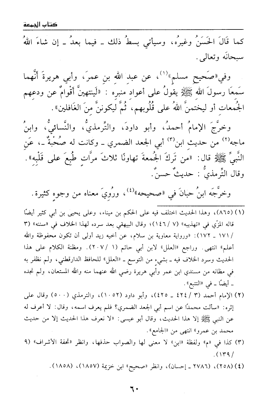 وخرج الإمام أحمد وأبو داود والترمذي والنسائي وابن ماجه من حديث أبي الجعد الضمري –وكانت له صحبة -، عن النبي - صَلَّى اللهُ عَلَيْهِ وَسَلَّمَ -، قال: ((من ترك الجمعة تهاوناً ثلاث مرات طبع على قلبه)) .