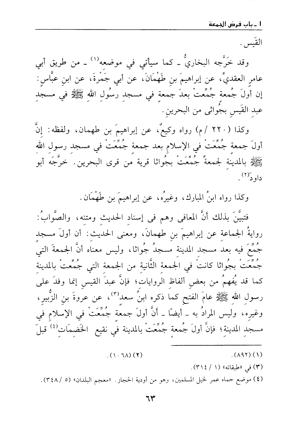 وكذا رواه وكيع، عن إبراهيم بن طهمان، ولفظه: إن أول جمعة جمعت في الإسلام –بعد جمعة جمعت في مسجد رسول الله - صَلَّى اللهُ عَلَيْهِ وَسَلَّمَ - بالمدينة –لجمعة جمعت بجواثاء – قرية من قرى البحرين.