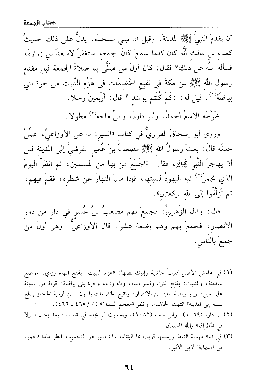 يدل على ذلك: حديث كعب بن مالكٍ، أنه كان كلما سمع أذان الجمعة استغفر لأسعد بن زرارة، فسأله ابنه عن ذلك، فقال: كان أول من صلى بنا صلاة الجمعة قبل مقدم رسول الله - صَلَّى اللهُ عَلَيْهِ وَسَلَّمَ - من مكة في نقيع الخضمات، في هزم النبيت، من حرة بني بياضة، قيل له: كم كنتم يومئذ؟ قال: أربعين رجلاً.