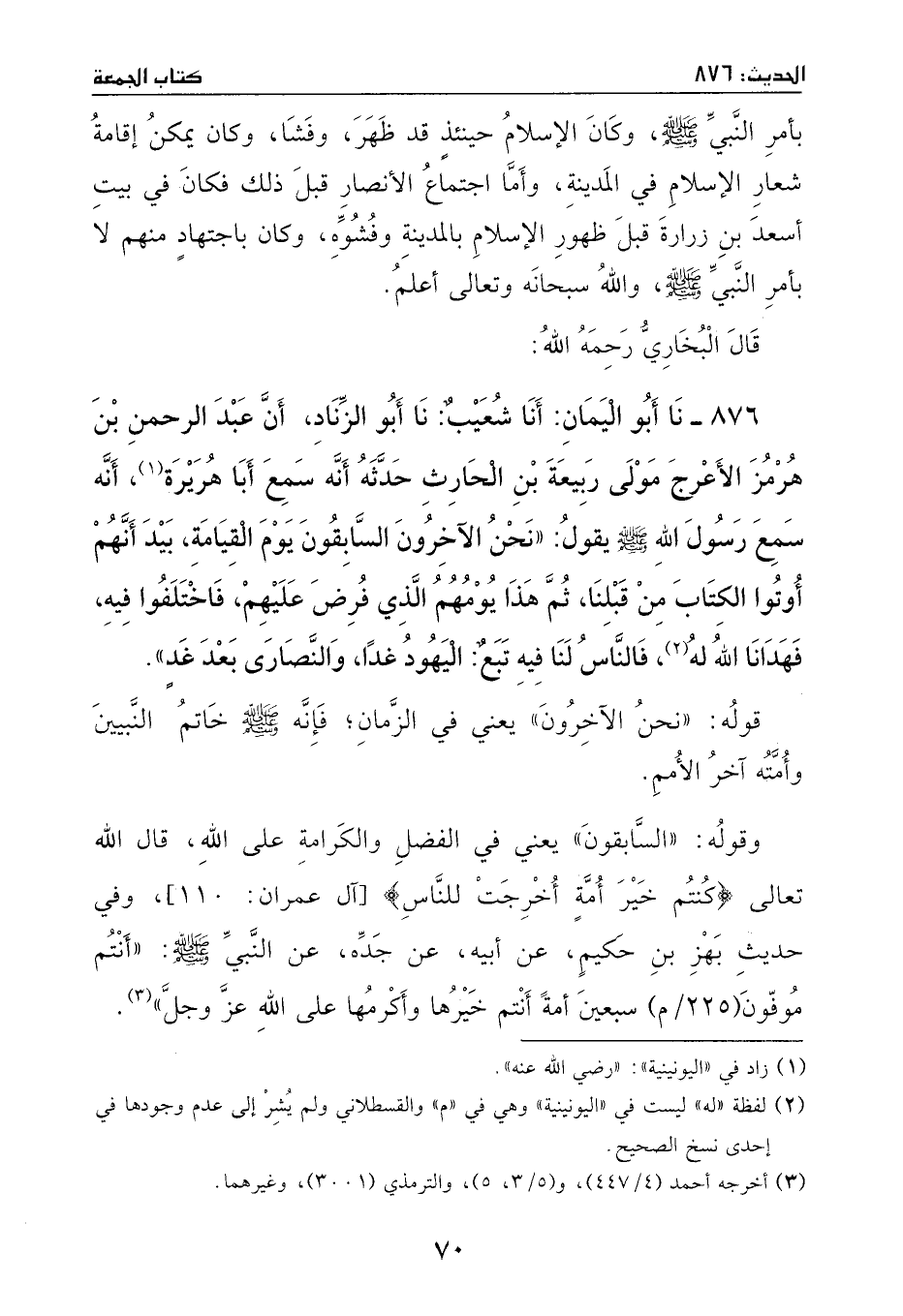 876 - نا أبو اليمان: أنا شعيب: نا أبو الزناد، أن عبد الرحمن بن هرمز الاعرج مولى ربيعة بن الحارث حدثه، أنه سمع أبا هريرة، أنه سمع رسول الله - صَلَّى اللهُ عَلَيْهِ وَسَلَّمَ - يقول: ((نحن الآخرون السابقون يوم القيامة، بيد أنهم أوتوا الكتاب من قبلنا، ثم هذا يومهم الذي فرض عليهم، فاختلفوا فيه، فهدانا الله له، فالناس لنا فيه تبع، اليهود غدا، والنصارى بعد غدٍ)) .