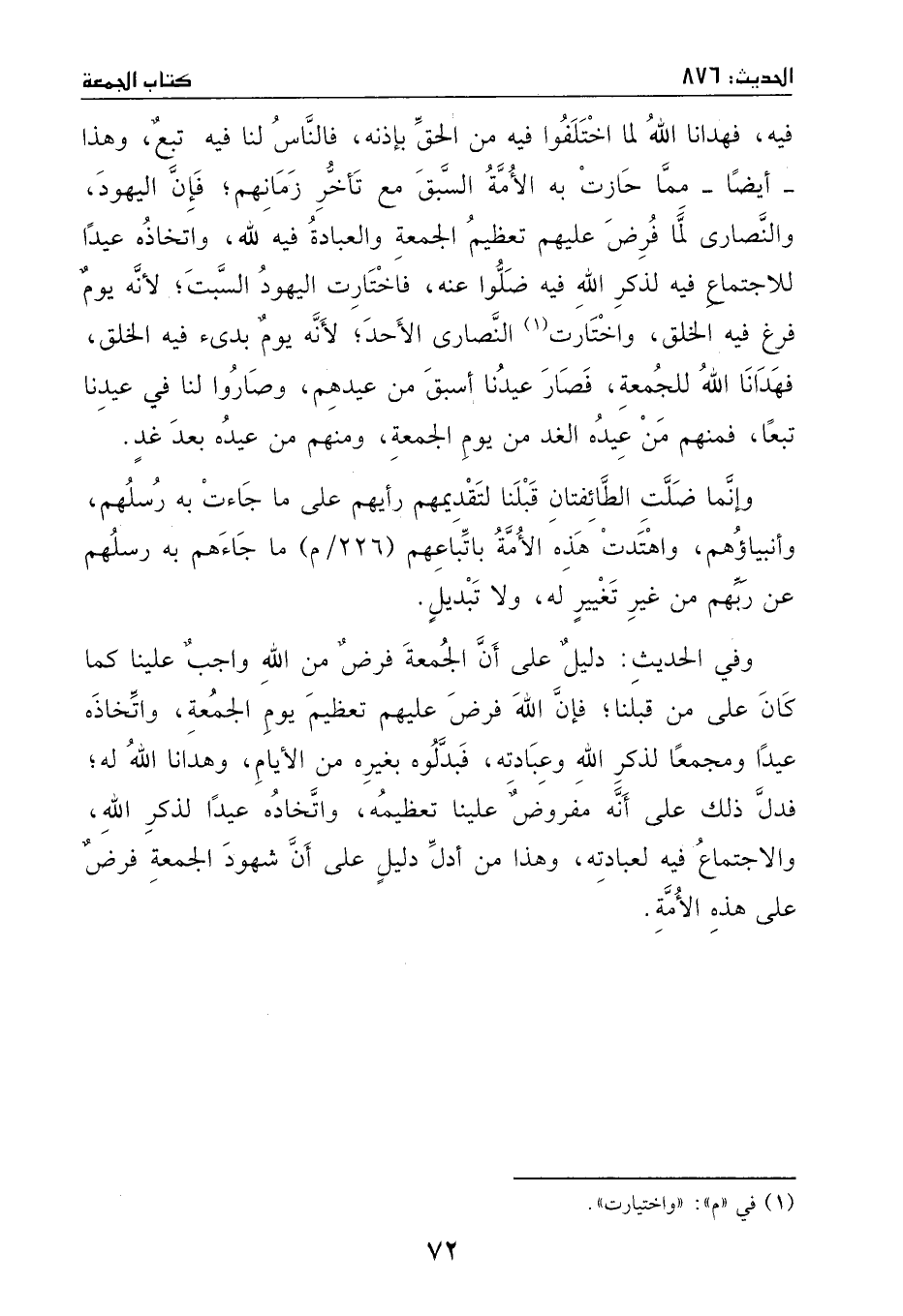 وعبادته، فبدلوه بغيره من الايام، وهدانا الله لهُ، فدل ذَلِكَ على أنه مفروض علينا تعظيمه، واتخاذه عيداً؛ لذكر الله والاجتماع فيه لعبادته، وهذا من أدل دليلٍ على أن شهود الجمعة فرض على هذه الأمة.