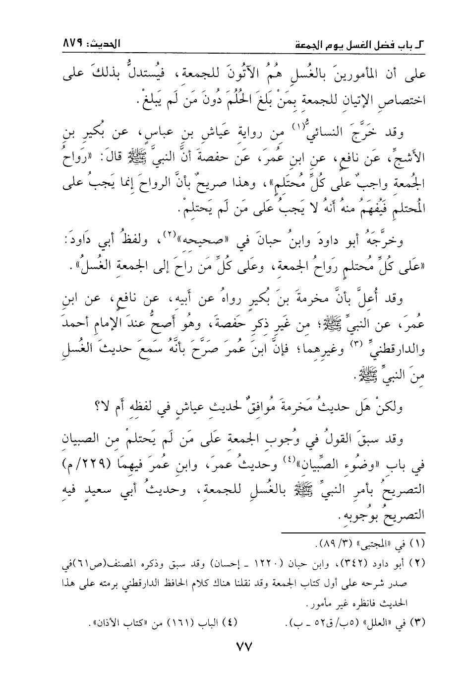 وخرَّجه أبو داود وابن حبان في ((صحيحه)) ، ولفظ أبي داود: ((على كل محتلمٍ رواح الجمعة، وعلى كل من راح إلى الجمعة الغسل)) .