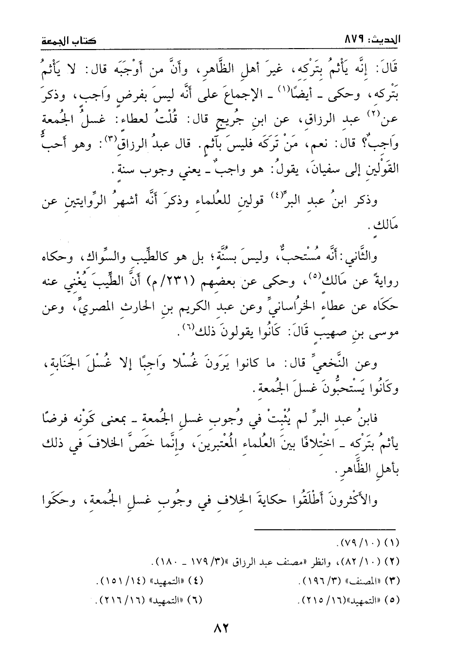 فابن عبد البر لم يثبت في وجوب غسل الجمعة –بمعنى كونه فرضاً يأثم بتركه – اختلافاً بين العلماء المعتبرين، وإنما خص الخلاف في ذَلِكَ باهل الظاهر.