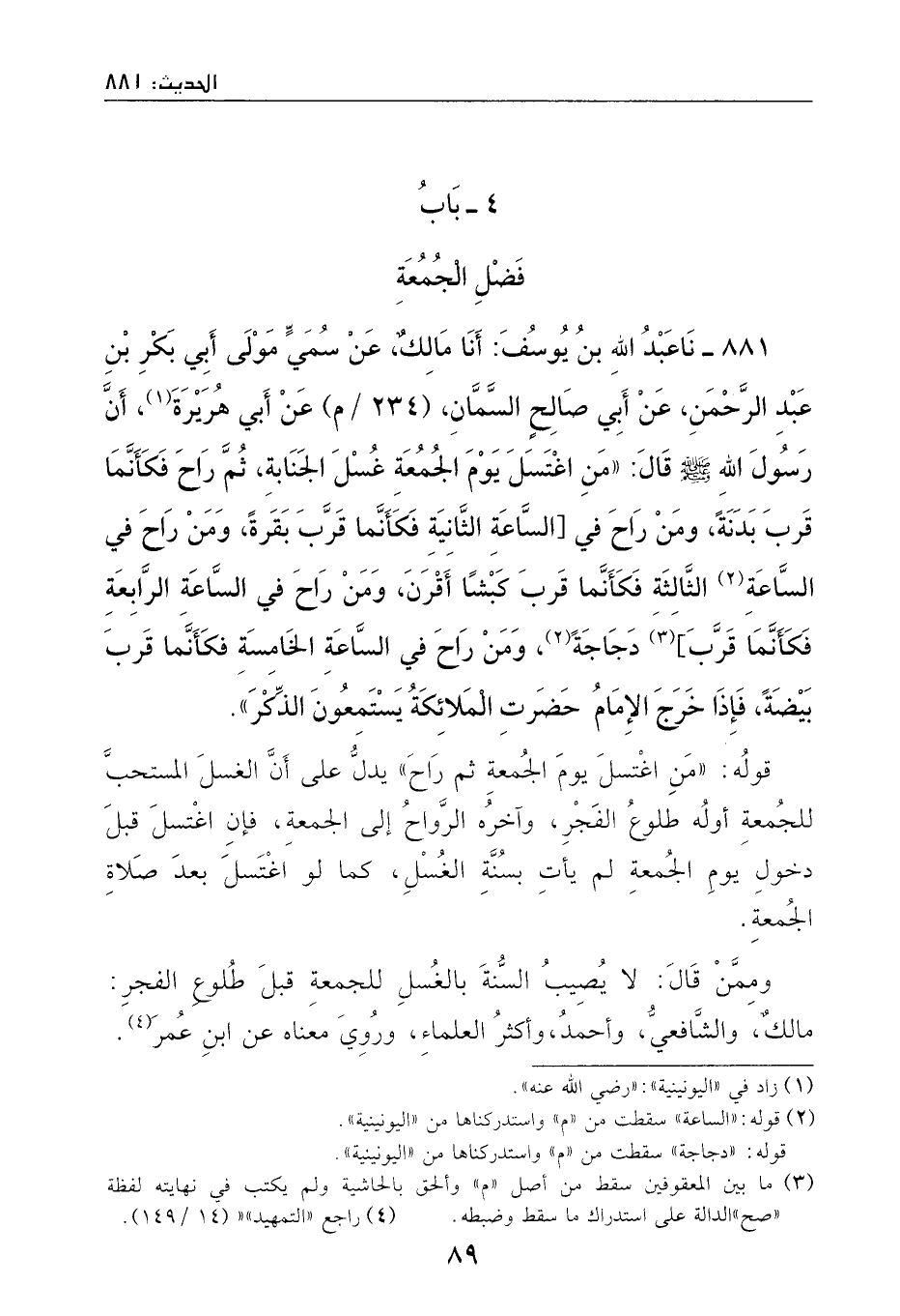 881 - ثنا عبد الله بن يوسف: أنا مالك، عن سمي مولى أبي بكر بن عبد الرحمن، عن أبي صالحٍ السمان، عن أبي هريرة، أن رسول الله - صَلَّى اللهُ عَلَيْهِ وَسَلَّمَ - قال: ((من اغتسل يوم الجمعة غسل الجنابة، ثم راح فكأنما قرب بدنة، ومن راح في الساعة الثانية فكأنما قرب بقرة، ومن راح في الساعة الثالثة فكانما قرب كبشاً أقرن، ومن راح في الساعة الرابعة فكأنما قرب دجاجة، ومن راح في الساعة الخامسة فكأنما قرب بيضة، فاذا خرج الإمام حضرت الملائكة يستمعون الذكر)) .