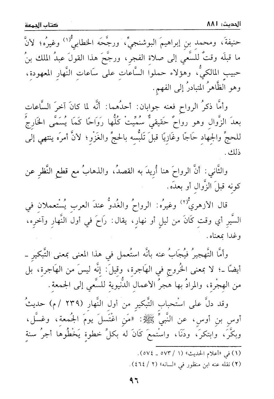 والثاني: أن الرواح هنا اريد به القصد والذهاب، مع قطع النظر عن كونه قبل الزوال أو بعده.