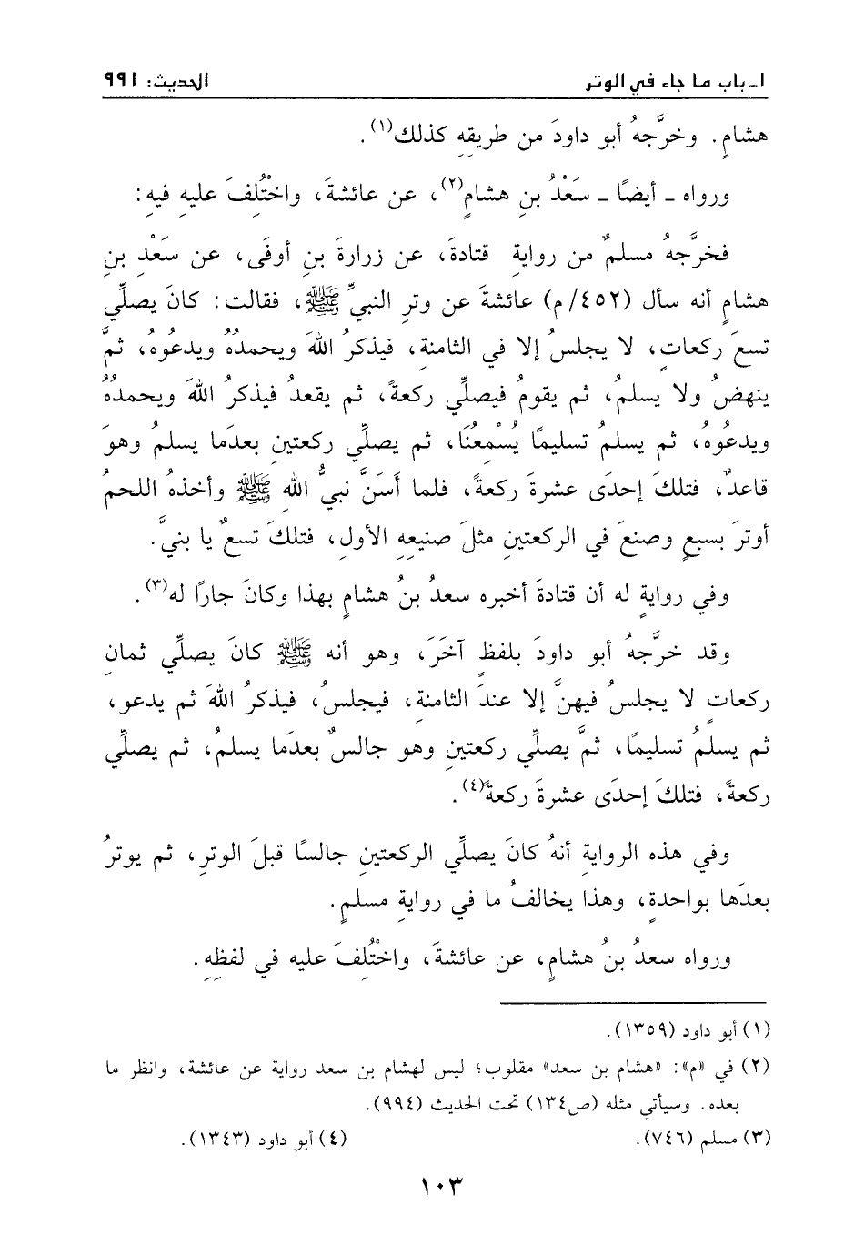 فخرجه مسلم من رواية قتادة، عن زرارة بن أوفى، عن سعد بن هشام، أنه سال عائشة عن وتر النبي - صَلَّى اللهُ عَلَيْهِ وَسَلَّمَ -، فقالت: كان يصلي تسع ركعات، لا يجلس إلا في الثامنة، فيذكر الله ويحمده ويدعوه، ثُمَّ ينهض ولا يسلم، ثم يقوم فيصلي ركعة، ثم يقعد، فيذكر الله ويحمده ويدعوه، ثم يسلم تسليماً يسمعنا، ثم يصلي ركعتين بعدما يسلم وهو قاعد، فتلك إحدى عشرة ركعة، فلما أسن نبي الله - صَلَّى اللهُ عَلَيْهِ وَسَلَّمَ - وأخذه اللحم أوتر بسبع، وصنع في الركعتين مثل صنيعه الأول، فتلك تسع يا بني.