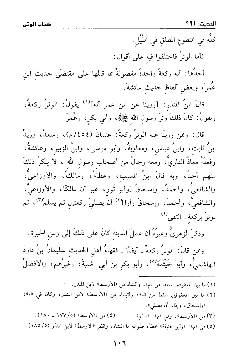 قالَ: وممن روينا عنه: الوتر ركعة: عثمان وسعد وزيد بن ثابت وابن عباس ومعاوية وأبو موسى وابن الزبير وعائشة، وفعله معاذ القاري، ومعه رجال من أصحاب رسول الله - صَلَّى اللهُ عَلَيْهِ وَسَلَّمَ -، لا ينكر ذلك منهم أحد.