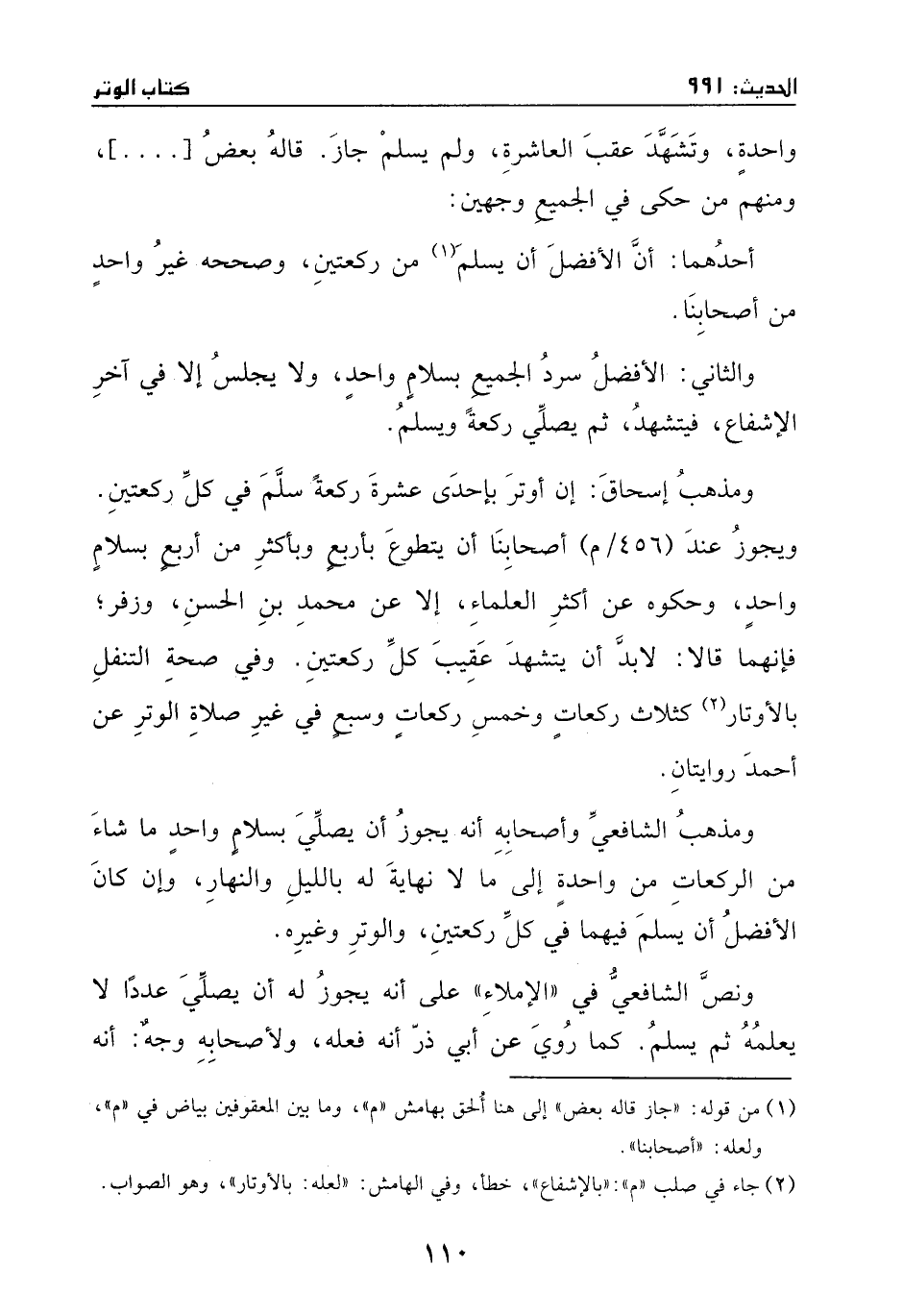 ومذهب الشافعي وأصحابه: أنه يجوز أن يصلي بسلام واحد، ما شاء من الركعات، من واحدة إلى ما لانهاية له بالليل والنهار، وإن كان الأفضل أن يسلم فيهما في كل ركعتين، والوتر وغيره.