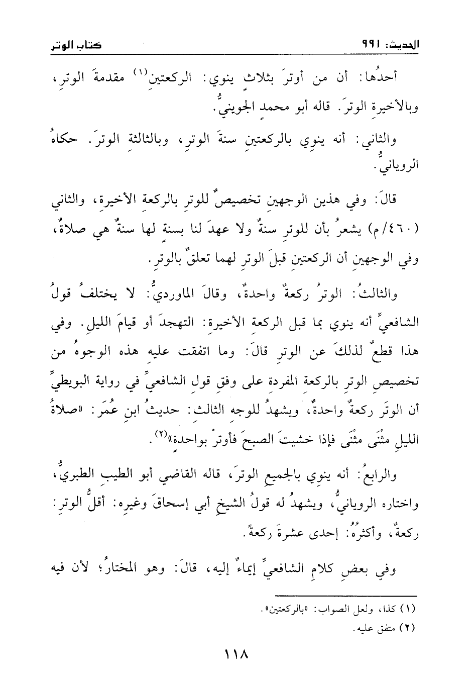 ويشهد للوجه الثالث حديث ابن عمر: ((صلاة الليل مثنى مثنى، فإذا خشيت الصبح، فأوتر بواحدة)) .