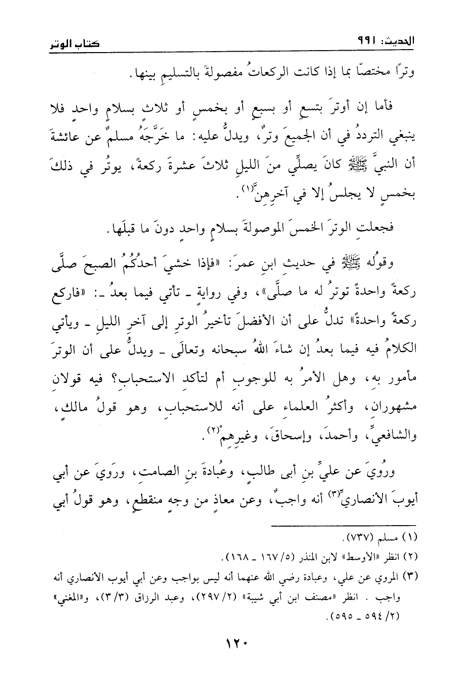 وتراً مختصاً بما إذا كانت الركعات مفصولة بالتسليم بينها، فأما إن أوتر بتسع، أو بسبع، أو بخمس، أو ثلاث بسلام