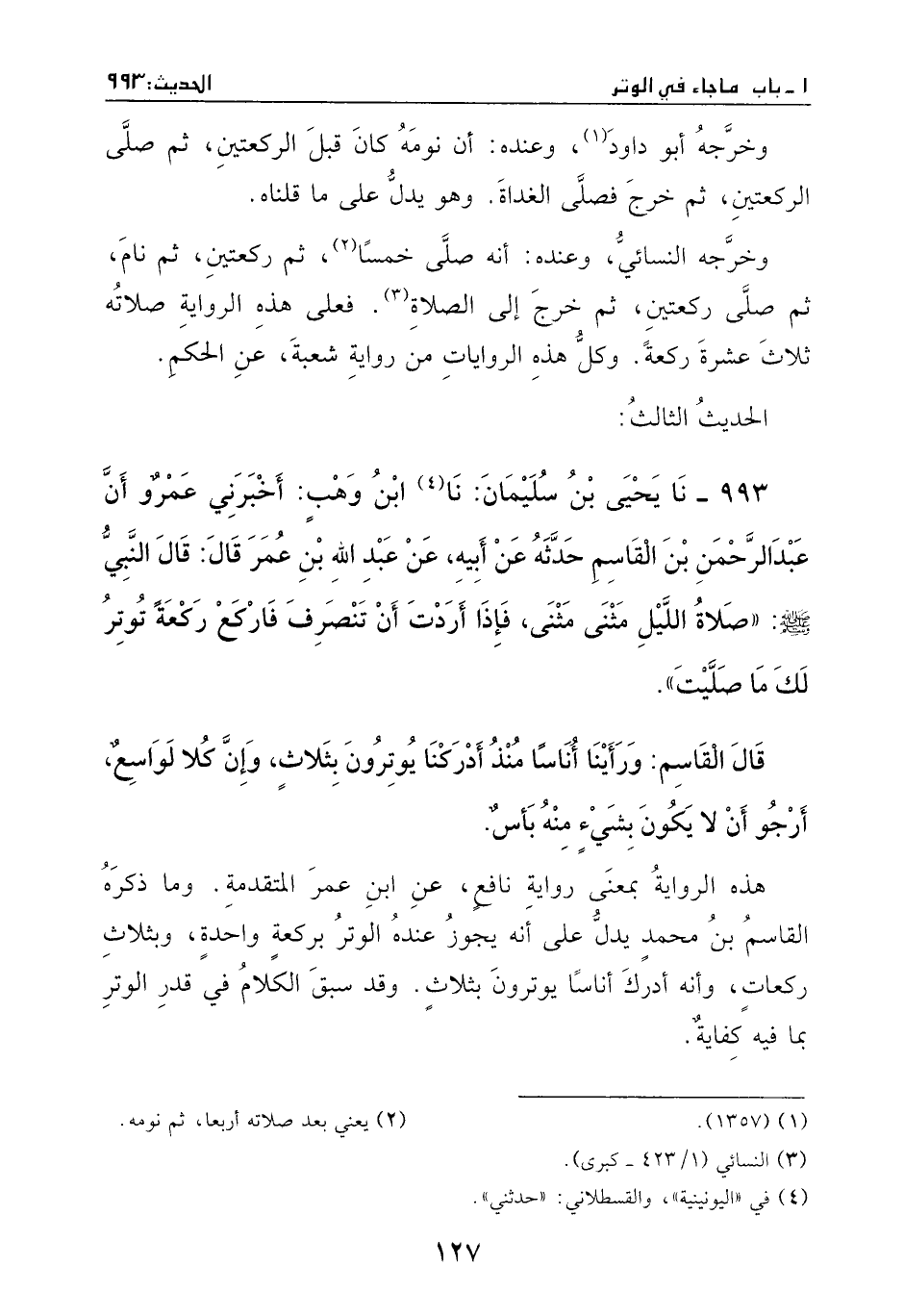وما ذكره القاسم بن محمد يدل على أنه يجوز الوتر بركعة واحدة، وبثلاث ركعات، وأنه أدرك أناسا يوترون بثلاث.