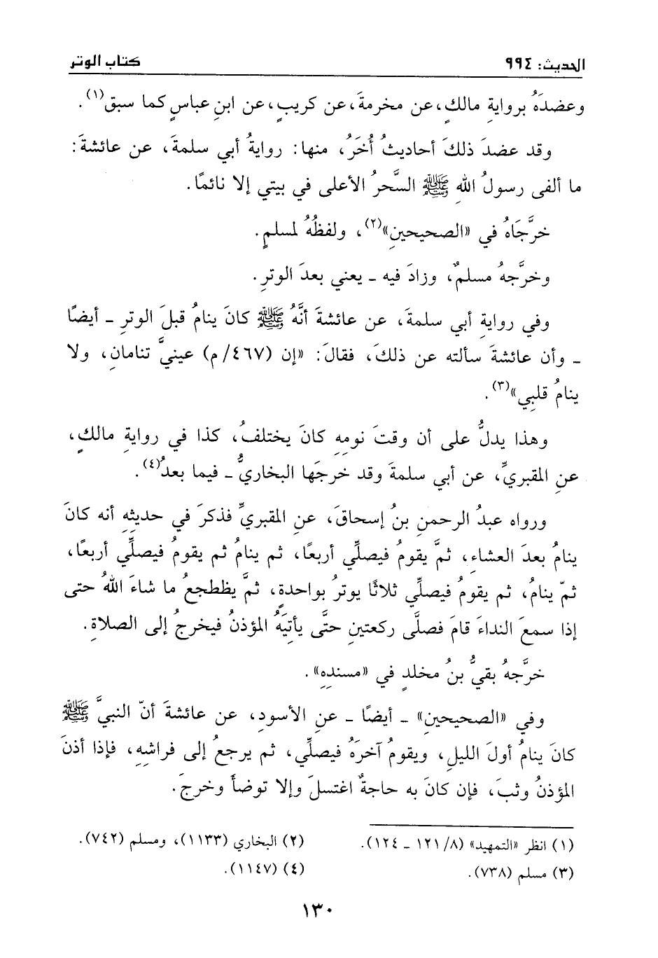 وفي رواية أبي سلمة، عن عائشة، أنه - صَلَّى اللهُ عَلَيْهِ وَسَلَّمَ - كان ينام قبل الوتر – أيضا - وأن عائشة سألته عن ذلك، فقال: ((أن عيني تنامان، ولا ينام قلبي)) وهذا يدل على أن وقت نومه كان يختلف.