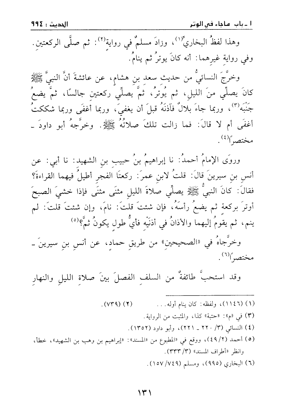 وخرج النسائي من حديث سعد بن هشام، عن عائشة، أن النبي - صَلَّى اللهُ عَلَيْهِ وَسَلَّمَ - كان يصلي من الليل، ثم يوتر، ثم يصلي ركعتين جالسا، ثم يضع جنبه، وربما جاء بلال فآذنه قبل أن يغفى، وربما أغفى، وربما شككت أغفى أم لا.