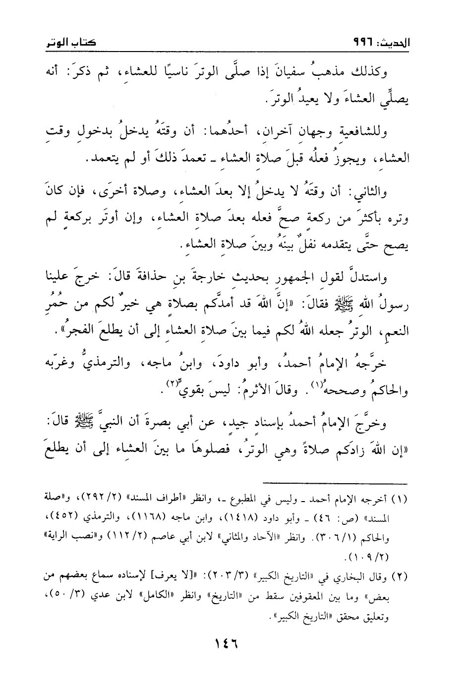 واستدل لقول الجمهور بحديث خارجة بن حذافة، قال: خرج علينا رسول الله - صَلَّى اللهُ عَلَيْهِ وَسَلَّمَ -، فقال: ((إن الله قد أمدكم بصلاة هي خير لكم من حمر النعم: الوتر، جعله الله لكم فيما بين صلاة العشاء إلى أن يطلع الفجر)) .