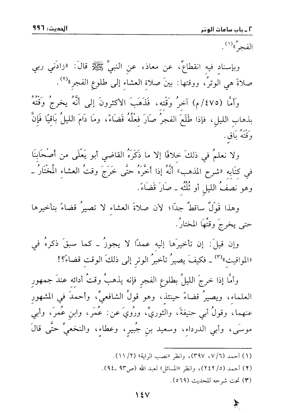 وأما آخر وقته، فذهب الأكثرون إلى أنه يخرج وقته بذهاب الليل، فإذا طلع الفجر صار فعله قضاء، وما دام الليل باقيا، فإن وقته باق.