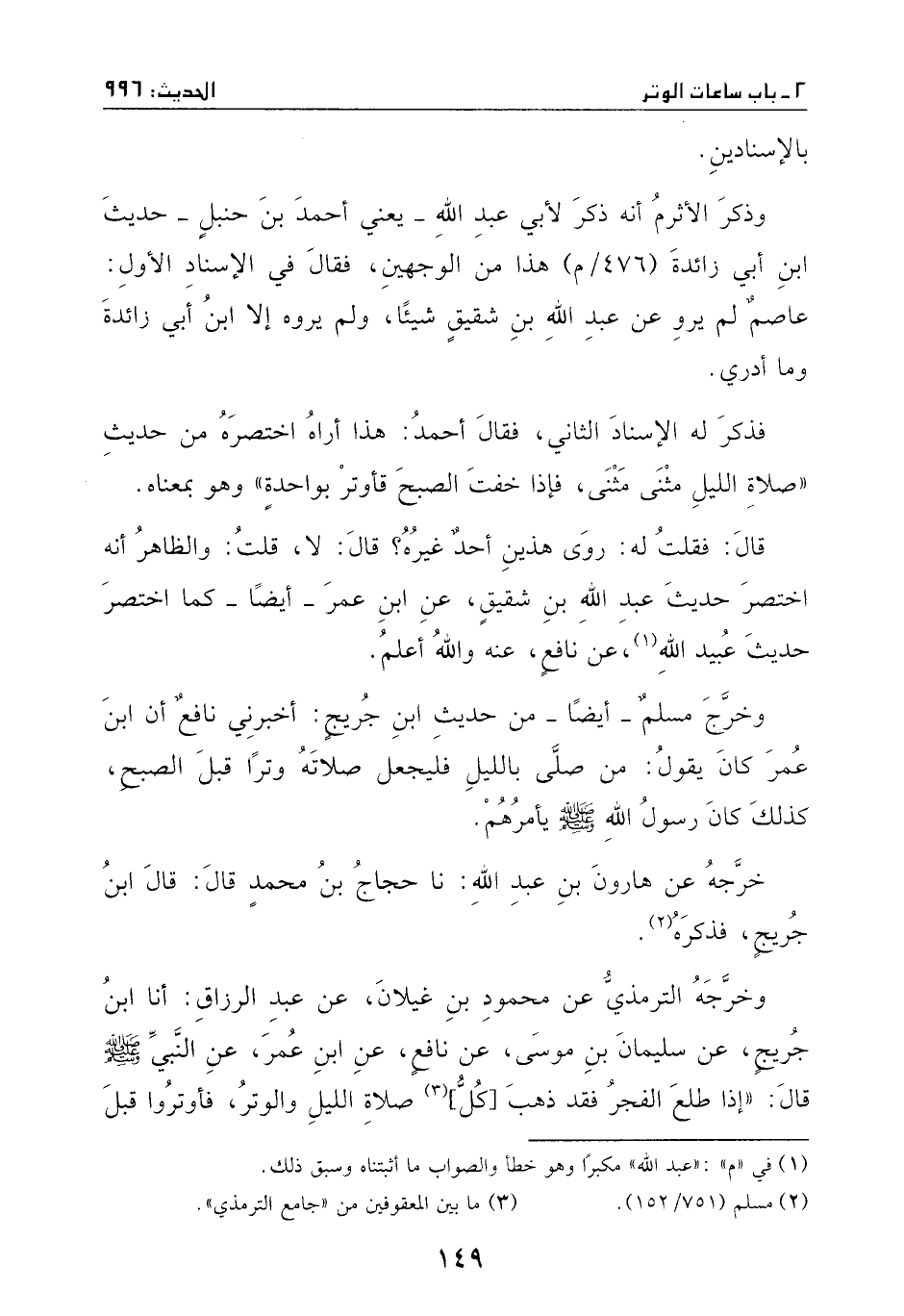وخرجه الترمذي عن محمود بن غيلان، عن عبد الرزاق: أنا ابن جريج، عن سليمان بن موسى، عن نافع، عن ابن عمر، عن النبي - صَلَّى اللهُ عَلَيْهِ وَسَلَّمَ -، قال: ((إذا طلع الفجر فقد ذهب [كل] صلاة الليل والوتر، فأوتروا قبل