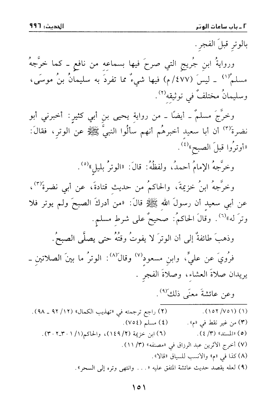 وخرج مسلم –أيضا – من رواية يحيى بن أبي كثير: أخبرني أبو نضرة، أن أبا سعيد أخبرهم، أنهم سألوا النبي - صَلَّى اللهُ عَلَيْهِ وَسَلَّمَ - عن الوتر، فقال: ((أوتروا قبل الصبح)) .