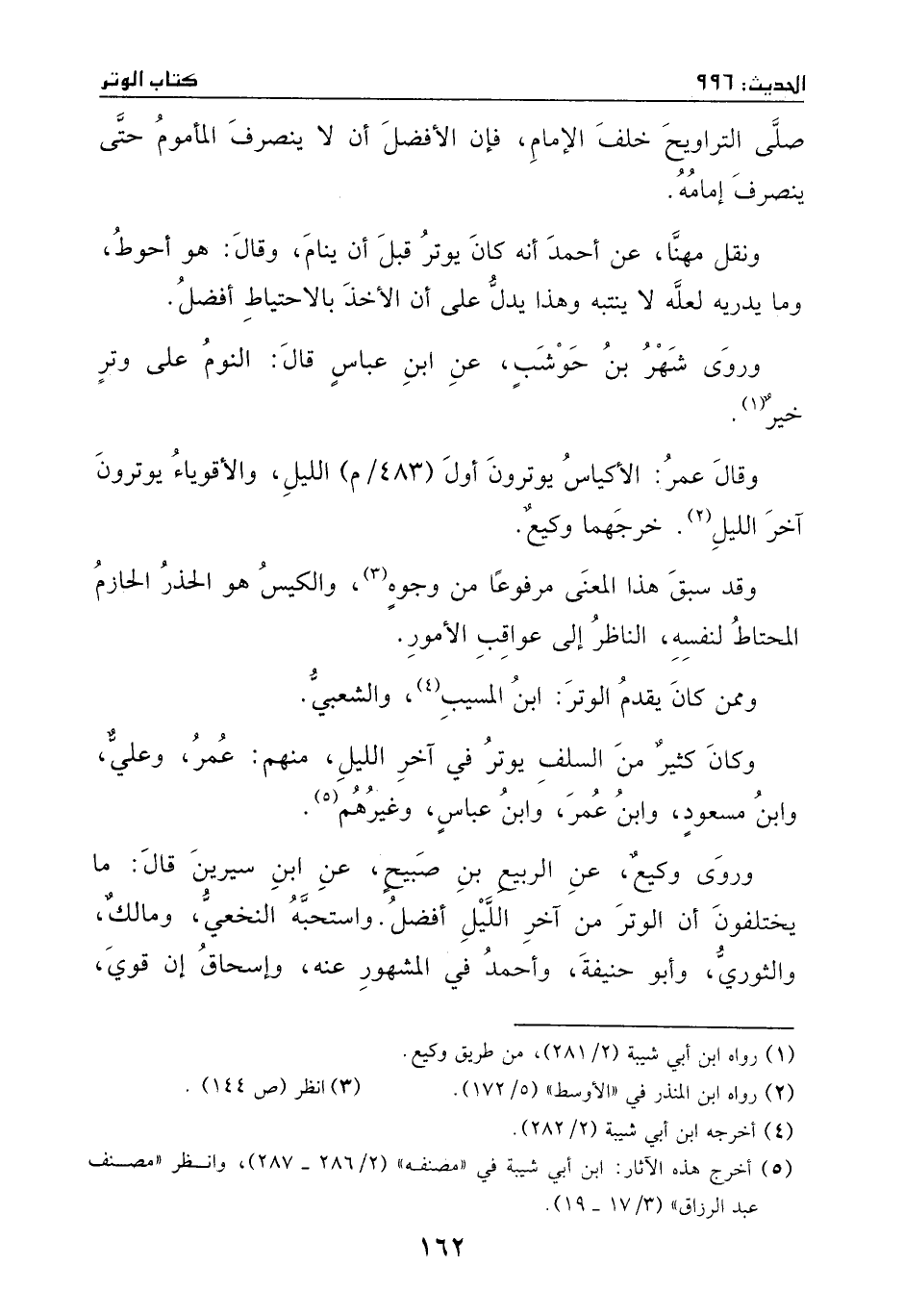 وكان أكثر من السلف يوتر في آخر الليل، منهم: عمر وعلي وابن مسعود وابن عمر وابن عباس وغيرهم.