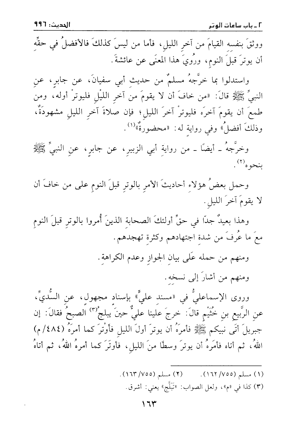 واستدلوا بما خرجه مسلم من حديث أبي سفيان، عن جابر، عن النَّبيّ - صَلَّى اللهُ عَلَيْهِ وَسَلَّمَ -، قال: ((من خاف أن لا يقوم من آخر الليل فليوتر أوله، ومن طمع أن يقوم آخره فليوتر آخر الليل، فان صلاة آخر الليل مشهودة، وذلك افضل)) .
