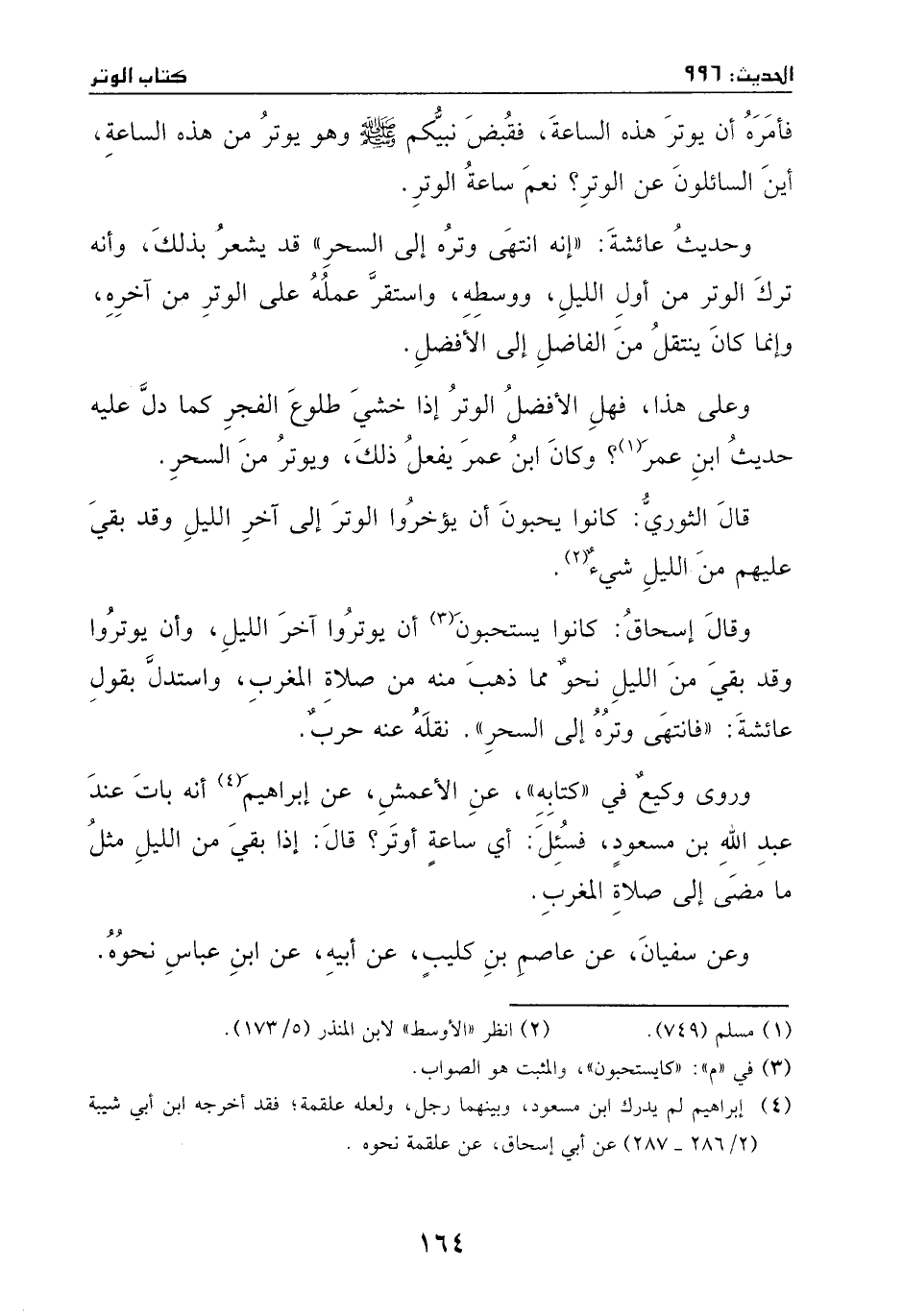 وروى وكيع في ((كتابه)) عن الأعمش، عن إبراهيم، أنه بات عند عبد الله ابن مسعود، فسئل: أي ساعة أوتر؟ قالَ: إذا بقي من الليل مثل ما مضى إلى صلاة المغرب.