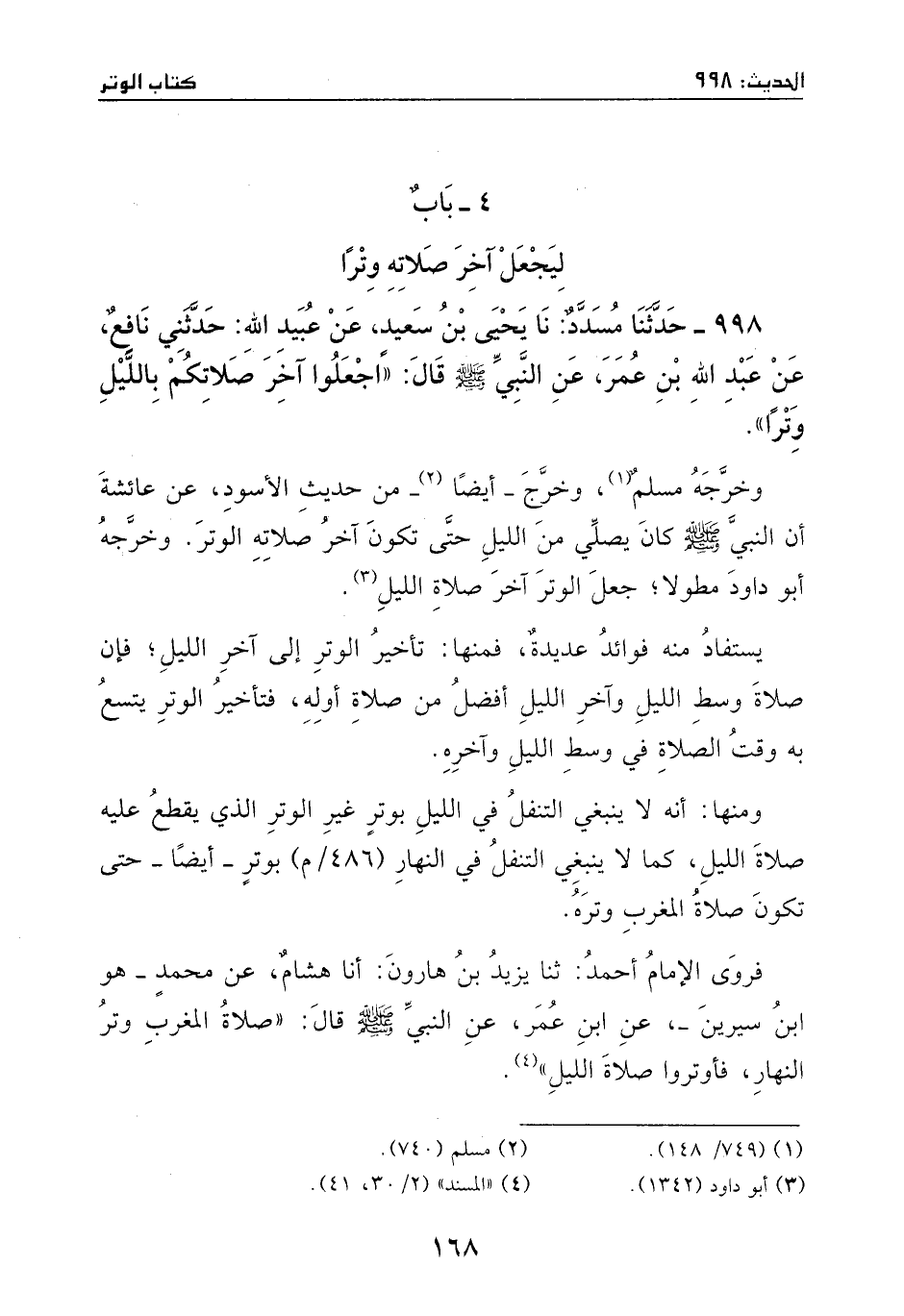 998 - حدثنا مسدد: نا يحيى بن سعيد، عن عبيد الله: حدثني نافع، عن عبد الله بن عمر، عن النبي - صَلَّى اللهُ عَلَيْهِ وَسَلَّمَ -، قال: ((اجعلوا آخر صلاتكم بالليل وتراً)) .