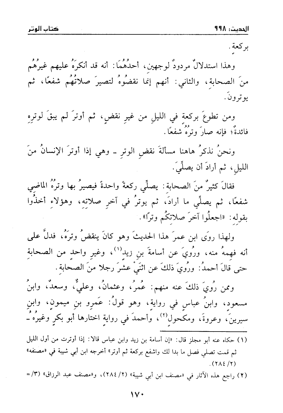 وهؤلاء اخذوا بقوله: ((اجعلوا آخر صلاتكم وتراً)) ، ولهذا روى ابن عمر هذا الحديث، وهو كان ينقض وتره، فدل على أنه فهمه منه.