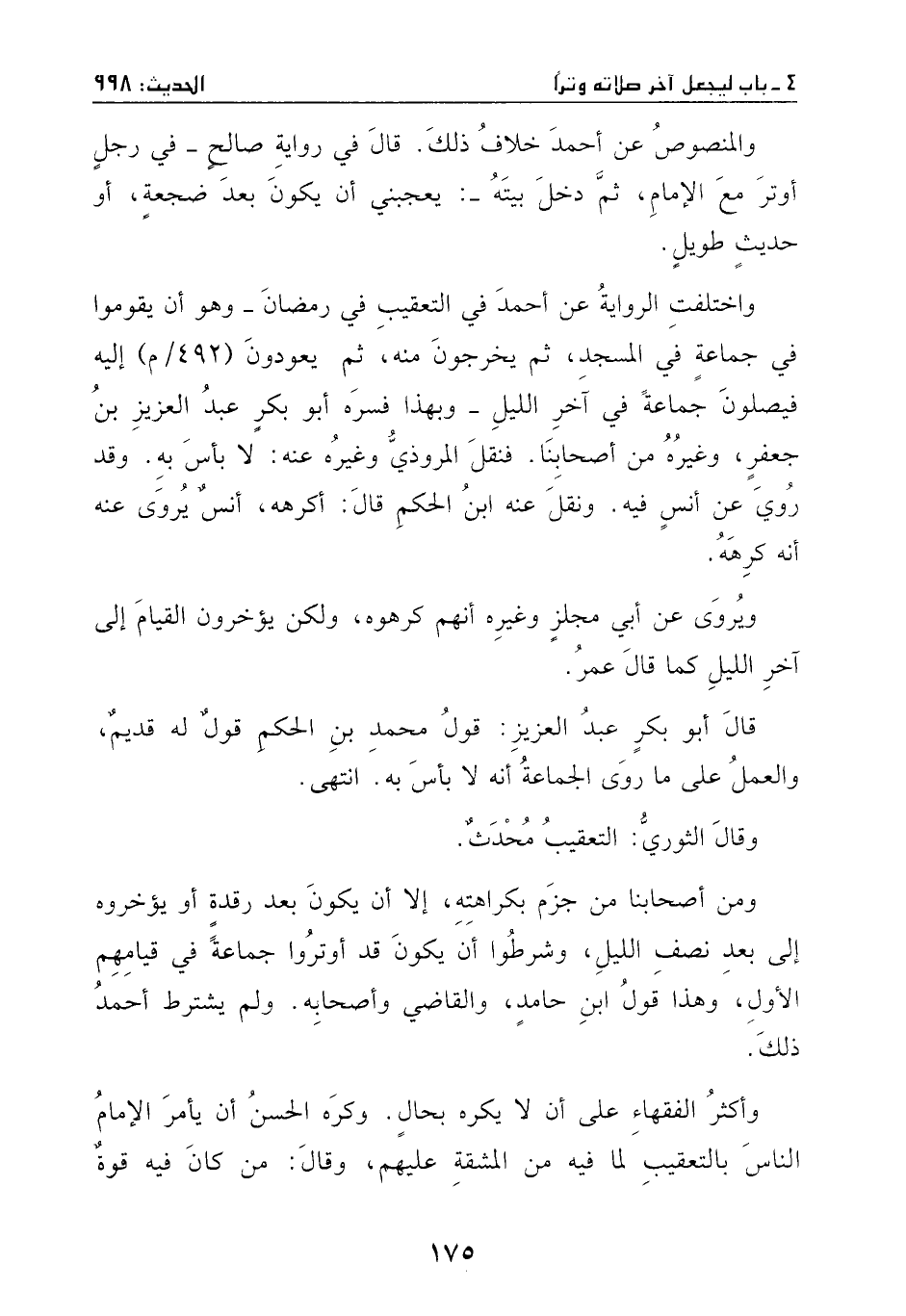 قال – في رواية صالح - في رجل أوتر مع الإمام، ثم دخل بيته -: يعجبني أن يكون بعد ضجعة أو حديث طويل واختلفت الرواية عن أحمد في التعقيب في رمضان، وهو: أن يقوموا في جماعة في المسجد، ثم يخرجون منه، ثم يعودون إليه فيصلون جماعة في آخر الليل.