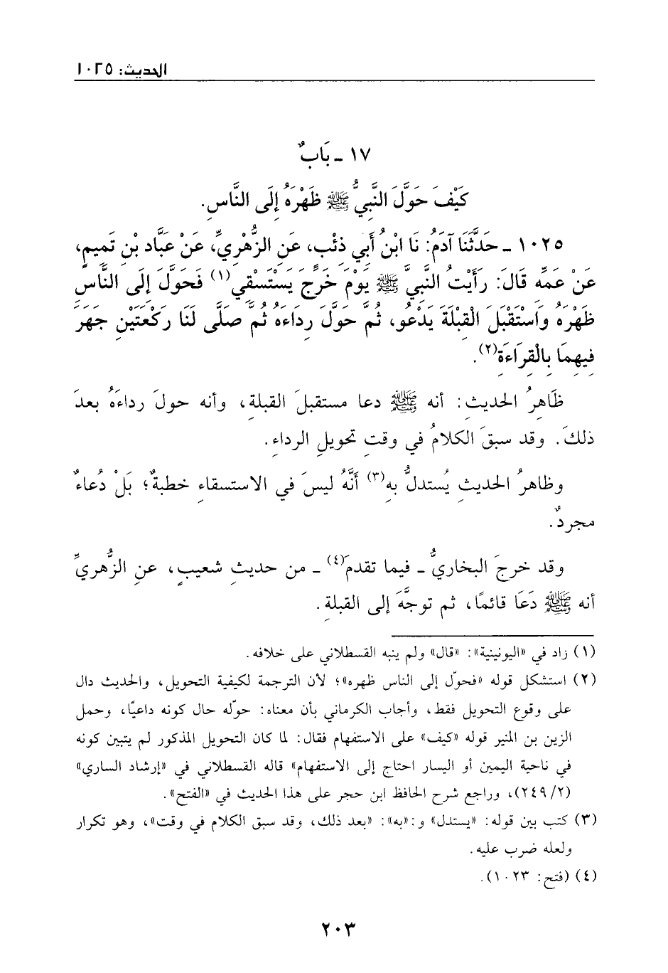 1025 - حدثنا آدم: نا بن أبي ذئب، عن الزهري، عن عباد بن تميم، عن عمه قالَ: رأيت النَّبيّ - صَلَّى اللهُ عَلَيْهِ وَسَلَّمَ - يوم خرج يستسقي، فحول إلى الناس ظهره، واستقبل القبلة