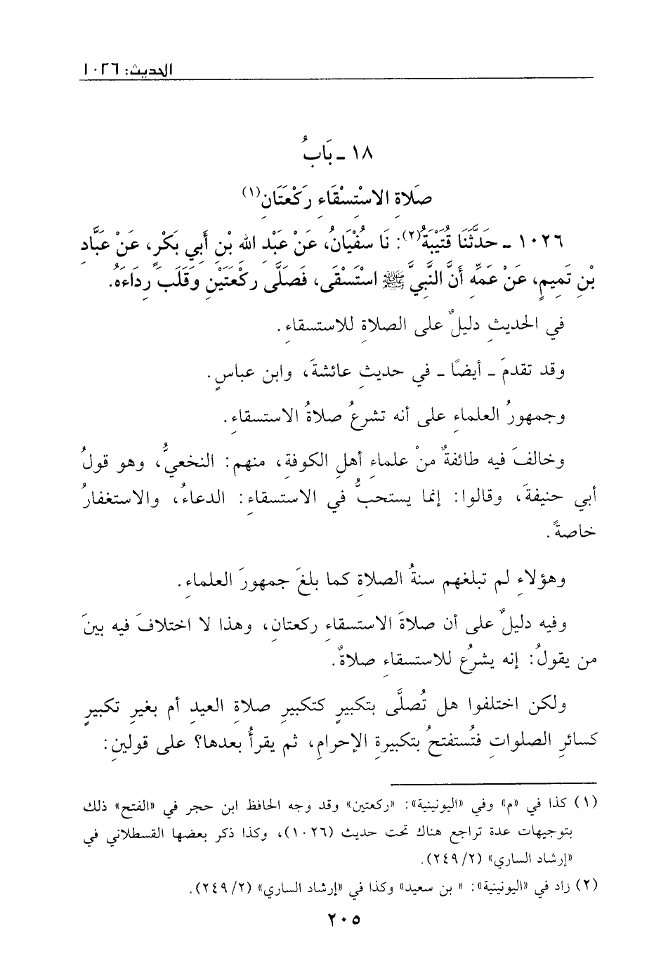 1026 - حدثنا قتيبة: نا سفيان، عن عبد الله بن أبي بكر، عن عباد بن تميم، عن عمه، أن النبي - صَلَّى اللهُ عَلَيْهِ وَسَلَّمَ - استسقى، فصلى ركعتين، وقلب رداءه.