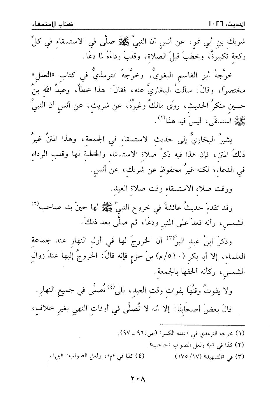 وخرّجه الترمذي في ((كتاب العلل)) –مختصراً -، وقال: سألت البخاري عنه، فقال: هذا خطأ، وعبد الله بن حسين منكر الحديث؛ روى مالك وغيره، عن شريك، عن أنس، أن النَّبيّ - صَلَّى اللهُ عَلَيْهِ وَسَلَّمَ - استسقى، ليس فيهِ هذا.