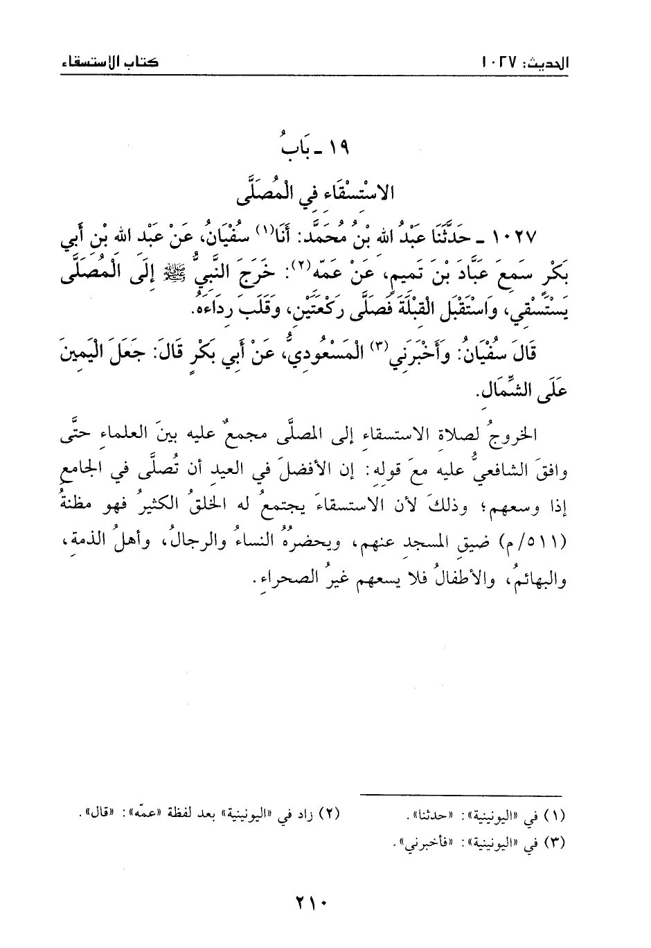 1027 - حدثنا عبد الله بن محمد: أنا سفيان، عن عبد الله بن أبي بكر: سمع عباد بن تميم، عن عمه،: خرج النبي - صَلَّى اللهُ عَلَيْهِ وَسَلَّمَ - إلى المصلى يستسقي، واستقبل القبلة، فصلى ركعتين، وقلب رداءه.
