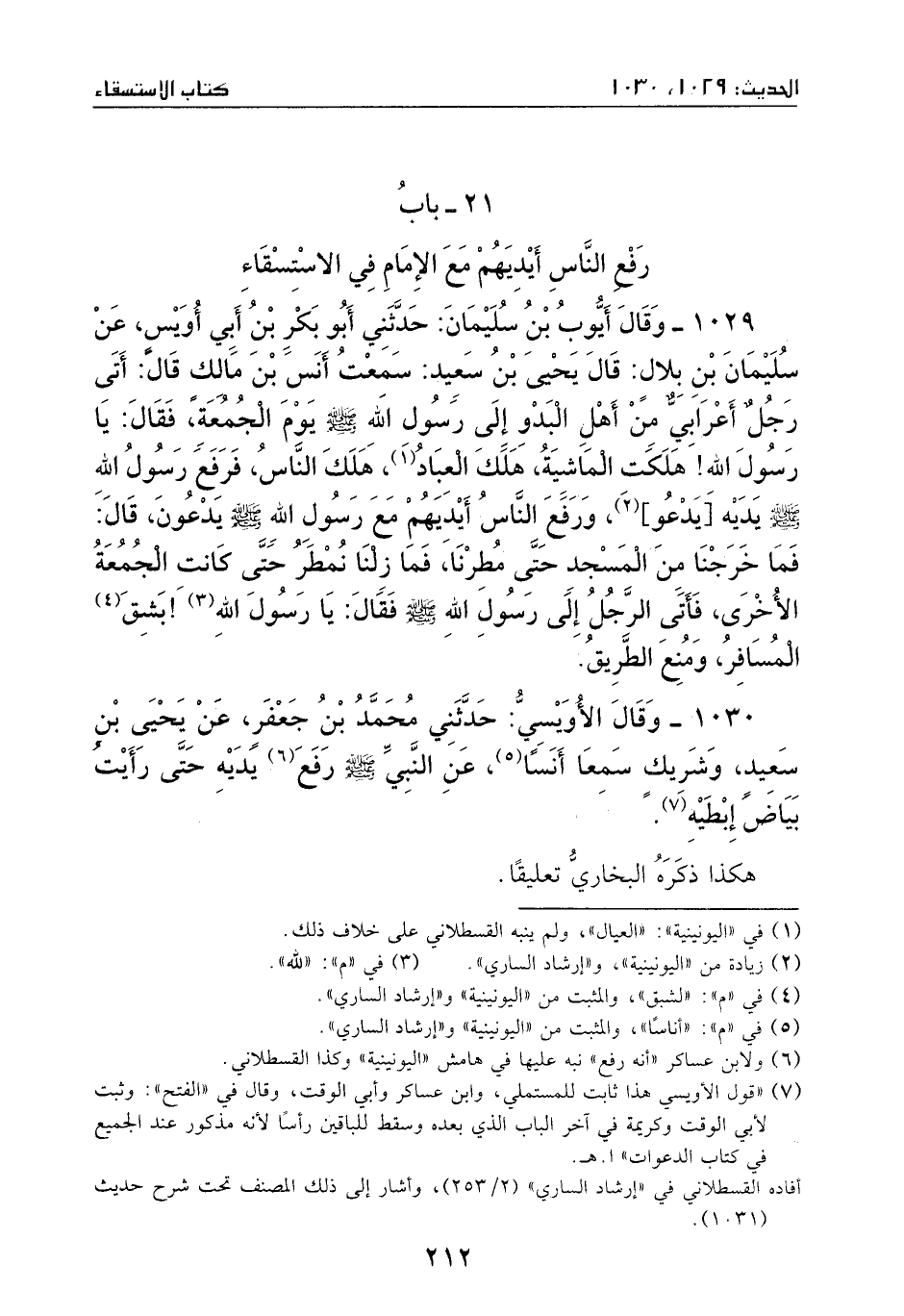 1029 - وقال أيوب بن سليمان: حدثني أبو بكر بن أبي اويس، عن سلمان بن بلال: قال يحيى بن سعيد: سمعت أنس بن مالك، قال: أتى رجل أعرابي من أهل البدو إلى رسول الله - صَلَّى اللهُ عَلَيْهِ وَسَلَّمَ - يوم الجمعة، فقال: يا رسول الله، هلكت الماشية، هلك العيال، هلك الناس، فرفع رسول الله - صَلَّى اللهُ عَلَيْهِ وَسَلَّمَ - يديه [يدعو] ، ورفع الناس أيديهم مع رسول الله - صَلَّى اللهُ عَلَيْهِ وَسَلَّمَ - يدعون. قال: فما خرجنا من المسجد حتى مطرنا، فما زلنا نمطر حتى كانت الجمعة الأخرى، فاتى الرجل إلى رسول الله - صَلَّى اللهُ عَلَيْهِ وَسَلَّمَ -، فقال: يا رسول الله - صَلَّى اللهُ عَلَيْهِ وَسَلَّمَ - بشق المسافر، ومنع الطريق.