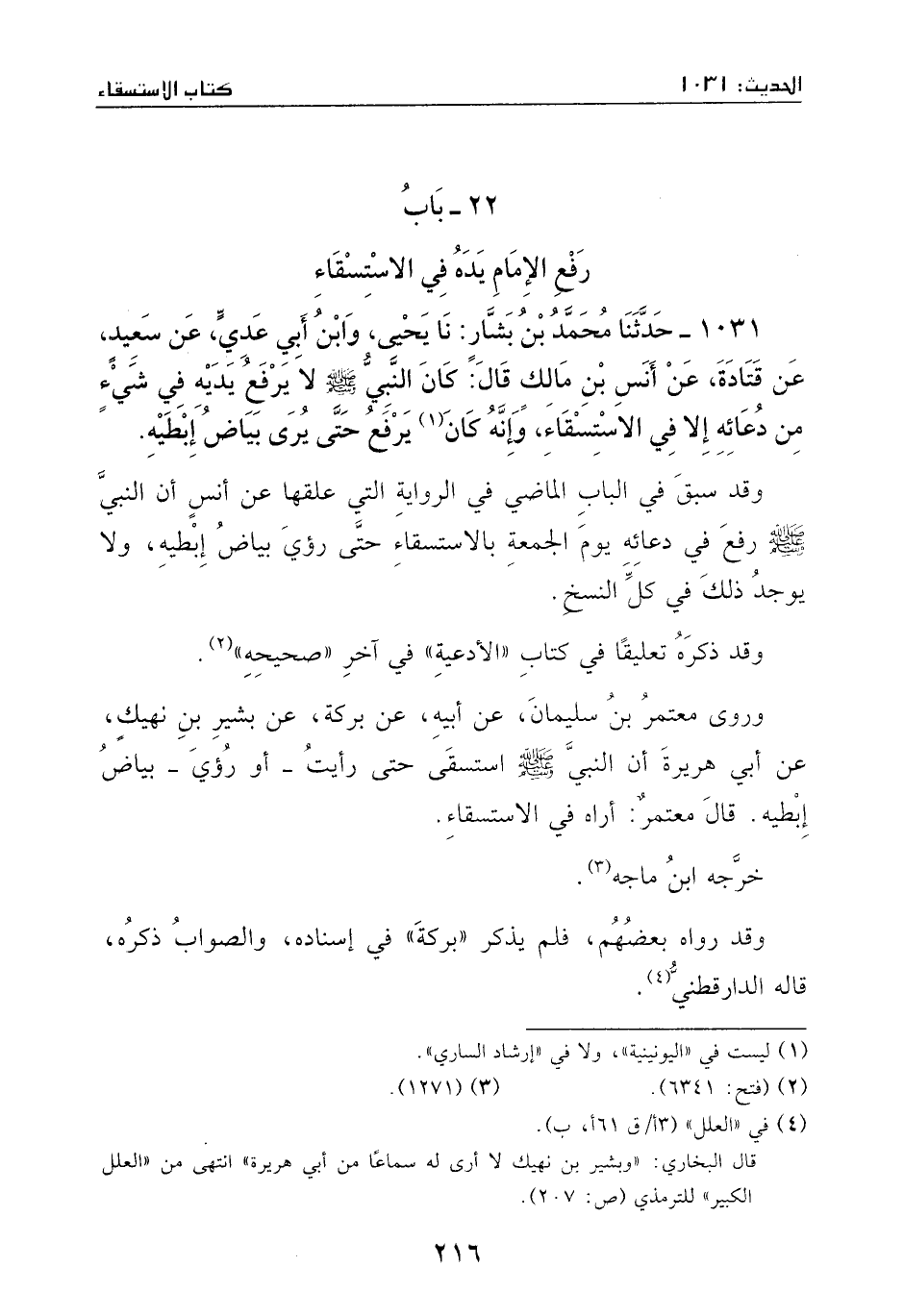 1031 - حدثنا محمد بن بشار: نا يحيى وابن أبي عدي، عن سعيد، عن قتادة، عن أنس بن مالك، قال: كان النبي - صَلَّى اللهُ عَلَيْهِ وَسَلَّمَ - لا يرفع يديه في شي من دعائه إلا في