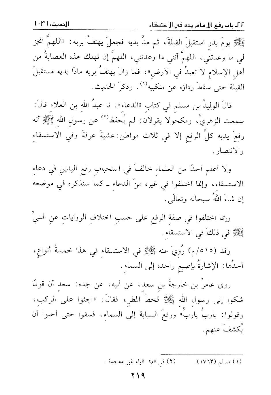 قال الوليد بن مسلم في ((كتاب الدعاء)) : نا عبد الله بن العلاء، قال: سمعت الزهري ومكحولا يقولان: لم نحفظ عن رسول الله - صَلَّى اللهُ عَلَيْهِ وَسَلَّمَ - أنه رفع يديه كل الرفع إلا في ثلاث مواطن: عشية عرفة، وفي الاستسقاء، والانتصار.