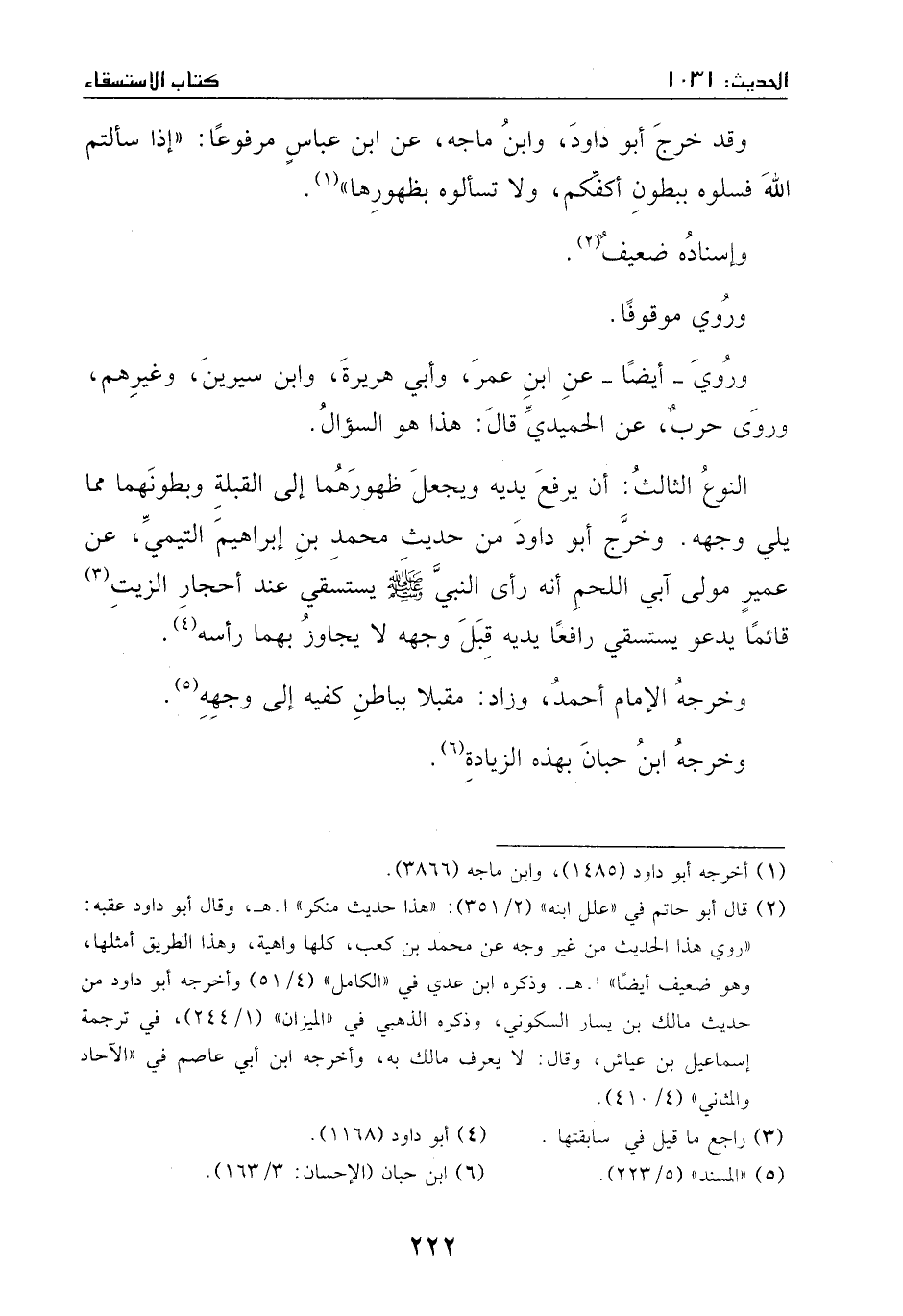 وقد خرج أبو داود وابن ماجه، عن ابن عباس - مرفوعا -: ((إذا سألتم الله فسلوه ببطون أكفكم، ولا تسألوه بظهورها)) .