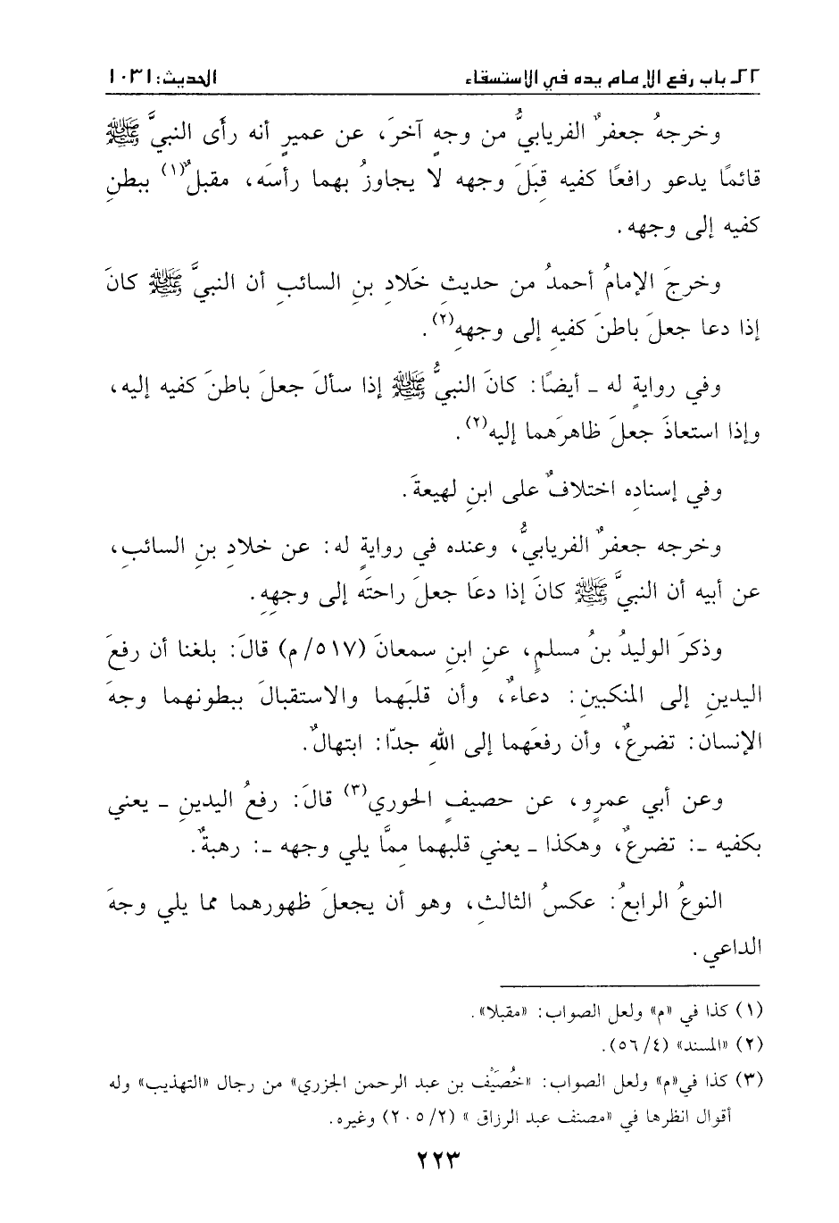 وخرجه جعفر الفريابي من وجه آخر، عن عمير، أنه رأى النَّبيّ - صَلَّى اللهُ عَلَيْهِ وَسَلَّمَ - قائما يدعو، رافعا كفيه قبل وجهه، لا يجاوز بهما رأسه، مقبلا ببطن كفيه إلى وجهه.