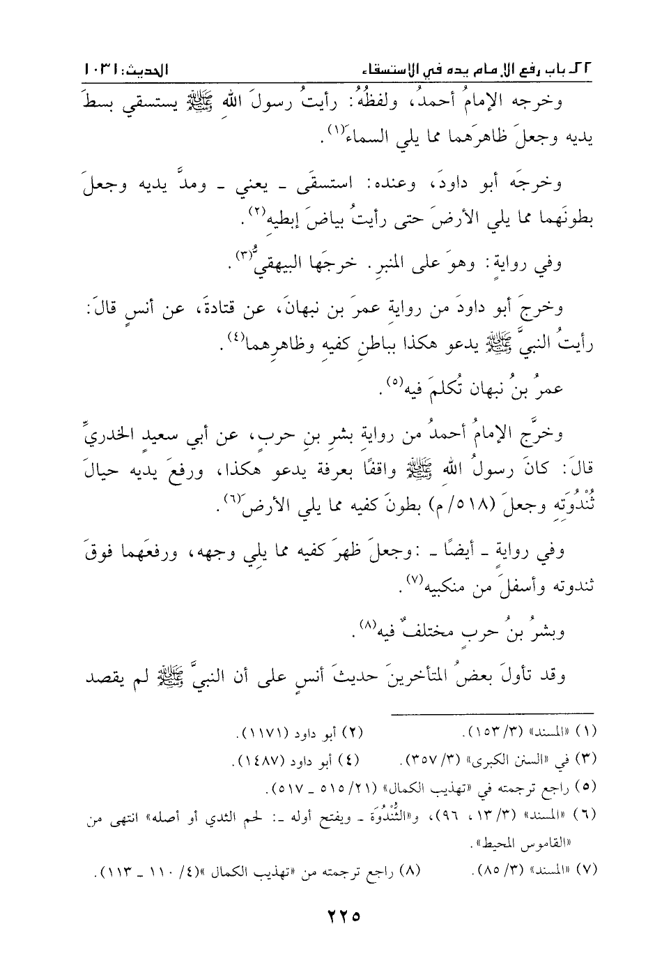 وخرجه الإمام أحمد، ولفظه: رأيت رسول الله - صَلَّى اللهُ عَلَيْهِ وَسَلَّمَ - يستسقي، بسط يديه، وجعل ظاهر هما مما يلي السماء.